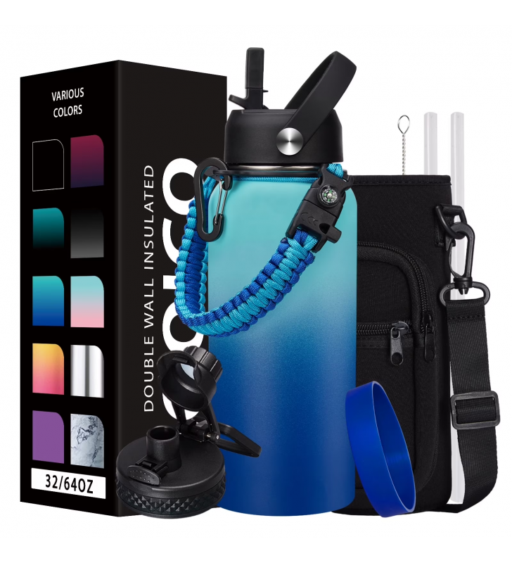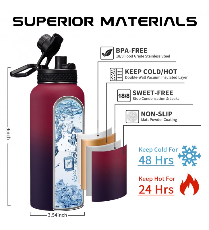 Hit your daily hydration goals. The OOICO 32 Fl. OZ. Wide-Mouth vacuum insulated water bottle keeps you hydrated from dawn to dusk with FEWER REFILLS! Our metal water bottles are constructed of recycled 18/8 stainless steel and double-wall vacuum insulation keep your favorite drinks ice-cold on hot days, and warm on cold days, promise every sip is your desire temperature!