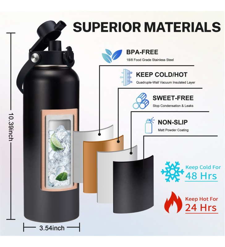 • 【KEEP COLD 48HRS & HOT 24HRS】The OOICO insulated water bottle features a cutting-edge quadruple-wall vacuum insulation, tested to keep drinks cold for up to 48 hours and hot for 24 hours. The metal water bottle's anti-sweat coating keeps the surface dry and clean, ensuring a comfortable grip and making it perfect for customizing with your favorite stickers.