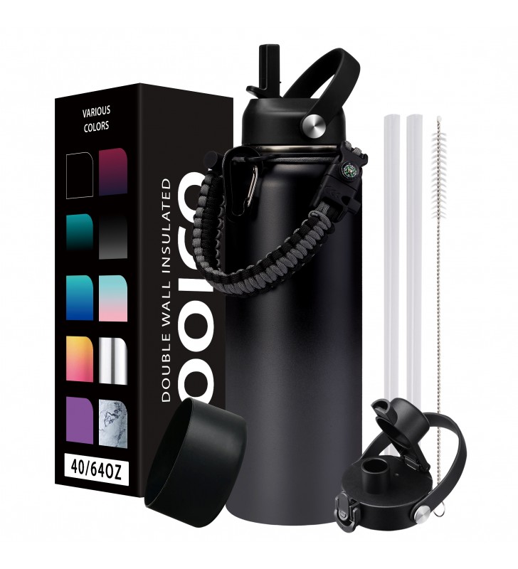 • 【PREMIUM MATERIALS】Crafted from food-grade 18/8 stainless steel, this water bottle is BPA-free, non-toxic, and completely safe for daily use.Water jug package included:water bottle,paracord handle,silicone boot,2 lids (straw lid & spout Lid), 2 straws,and straw brush. The included silicone boot offers added protection for your flask.