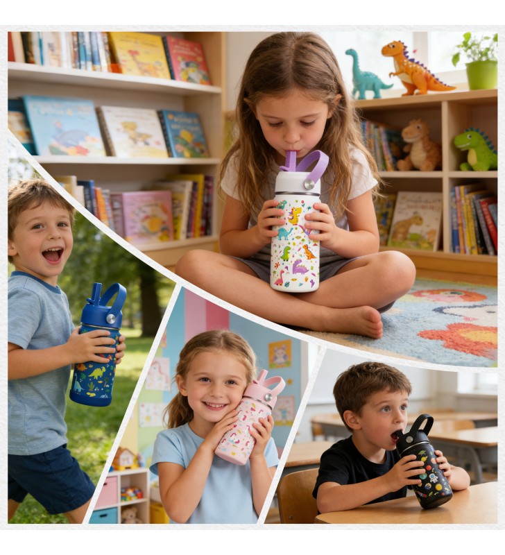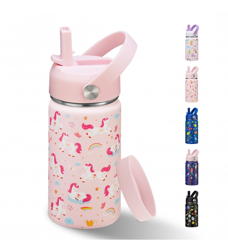 • 【PERFECT BACK-TO-SCHOOL GIFT】 OOICO cute water bottle with kids favorite patterns, including Dinosaur, Space, Car & Truck, Mermaid and Unicorn. Ideal for school, birthday and holiday gifts. Value set includes: 12oz kids water bottle, 1 x straw lid, 1 x silicone boot, 1 x straw.