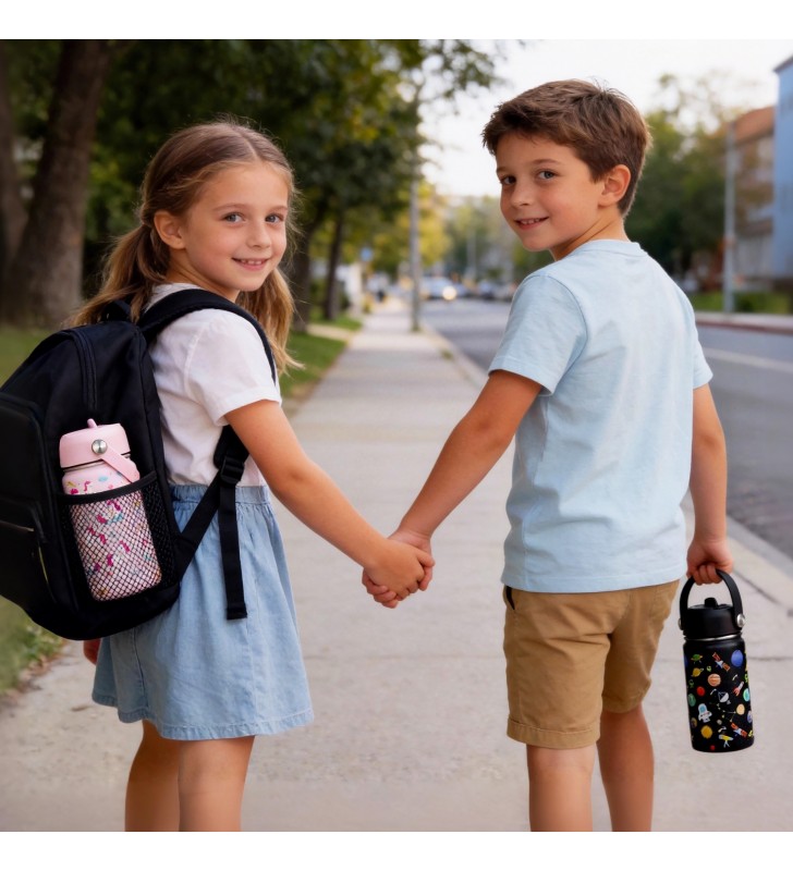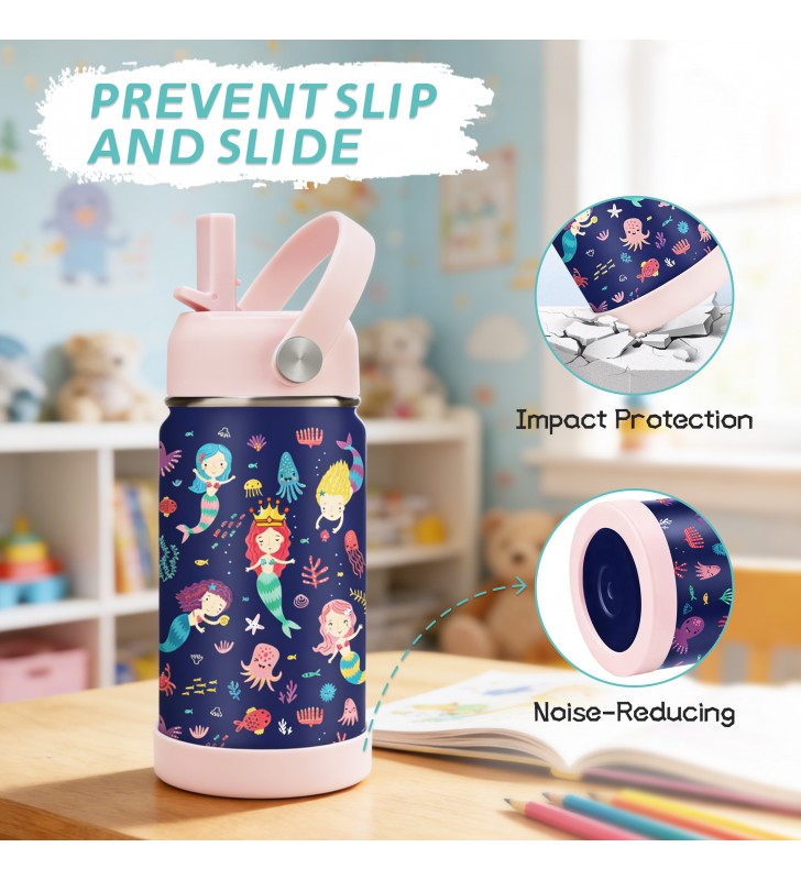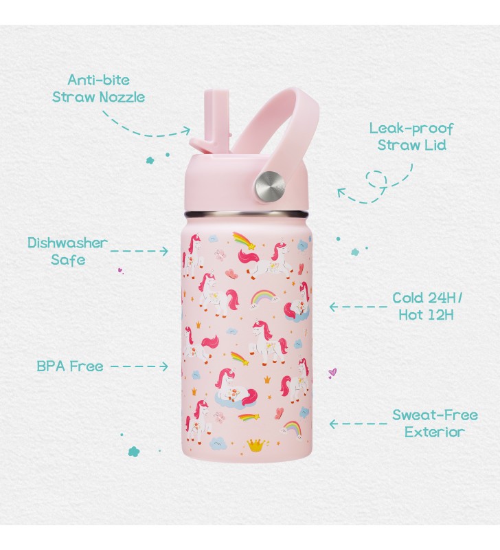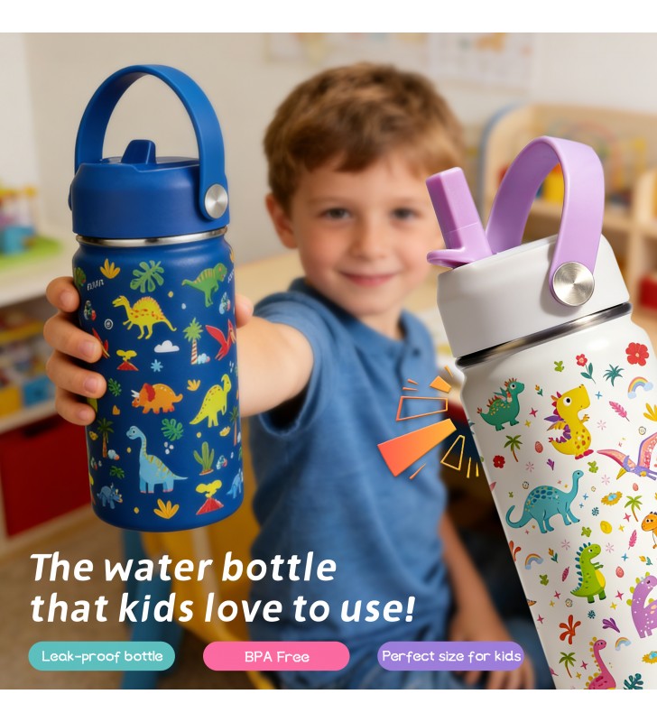 • 【BPA FREE KIDS WATER BOTTLE】 Made of food-grade 18/8 stainless steel, this 12oz kids insulated water bottle is BPA free, rust-resistant and safe for everyday drinking. Durable, reusable and eco-friendly, it keeps drinks fresh and clean for school and daily use.