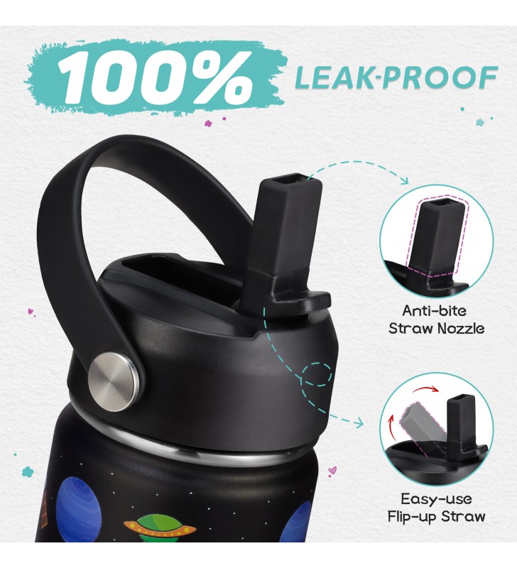 • 【LEAK PROOF STRAW LID】 This leak proof water bottle features a flip-up straw lid with a tight silicone seal. 360° leak-proof when closed, perfect for school bags and travel. The anti-bite straw nozzle is designed for toddlers and kids, helping prevent chewing damage.